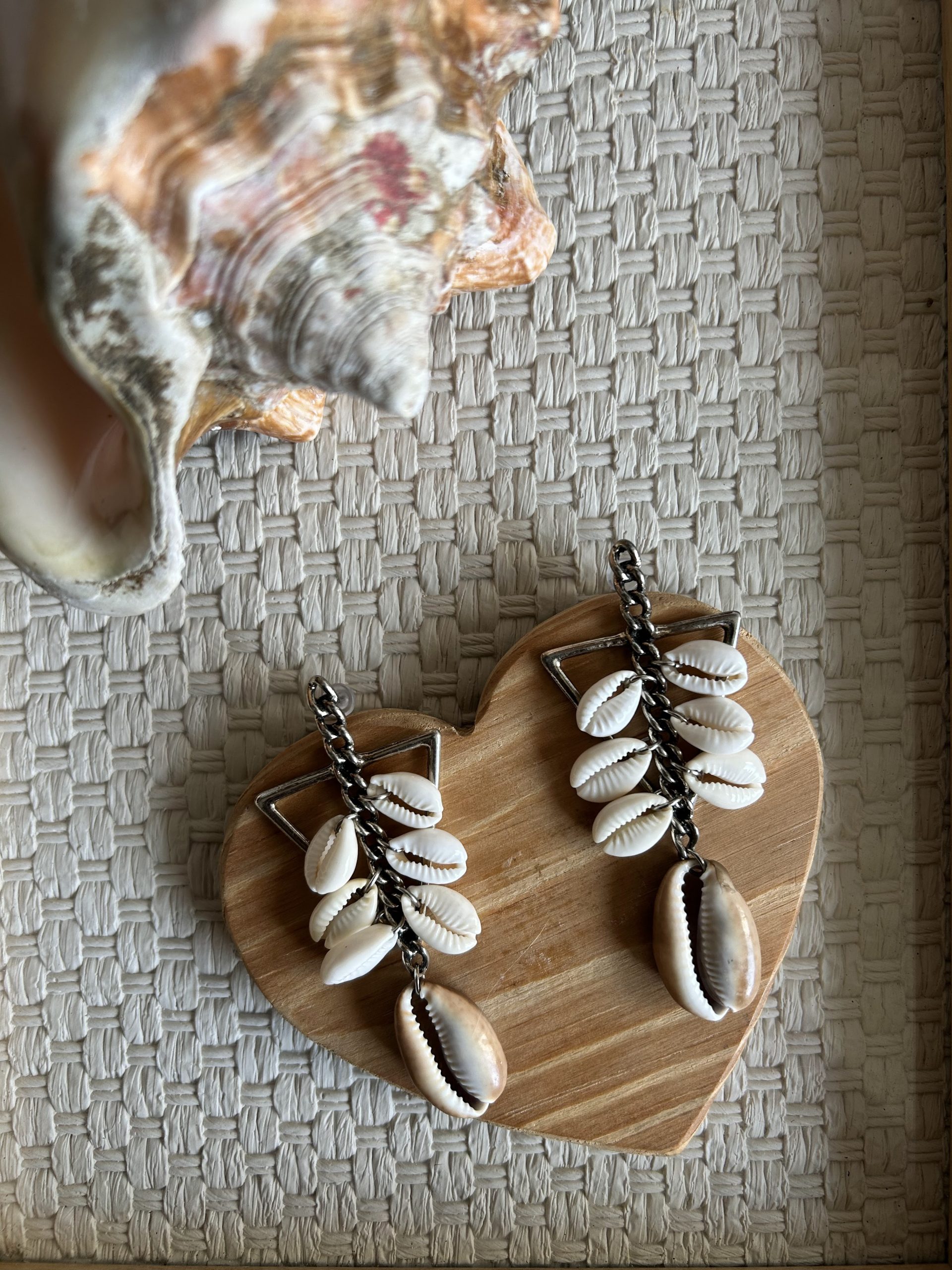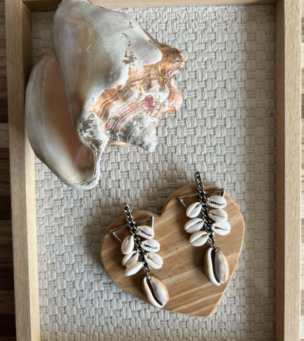 Brinco de base em cor prata, metal antialérgico, composto por seis búzio pequenos em cascata e um búzio médio africano ( marrom) central. Brinco criado após pesquisa sobre a História do Terreiro da Casa Branca.