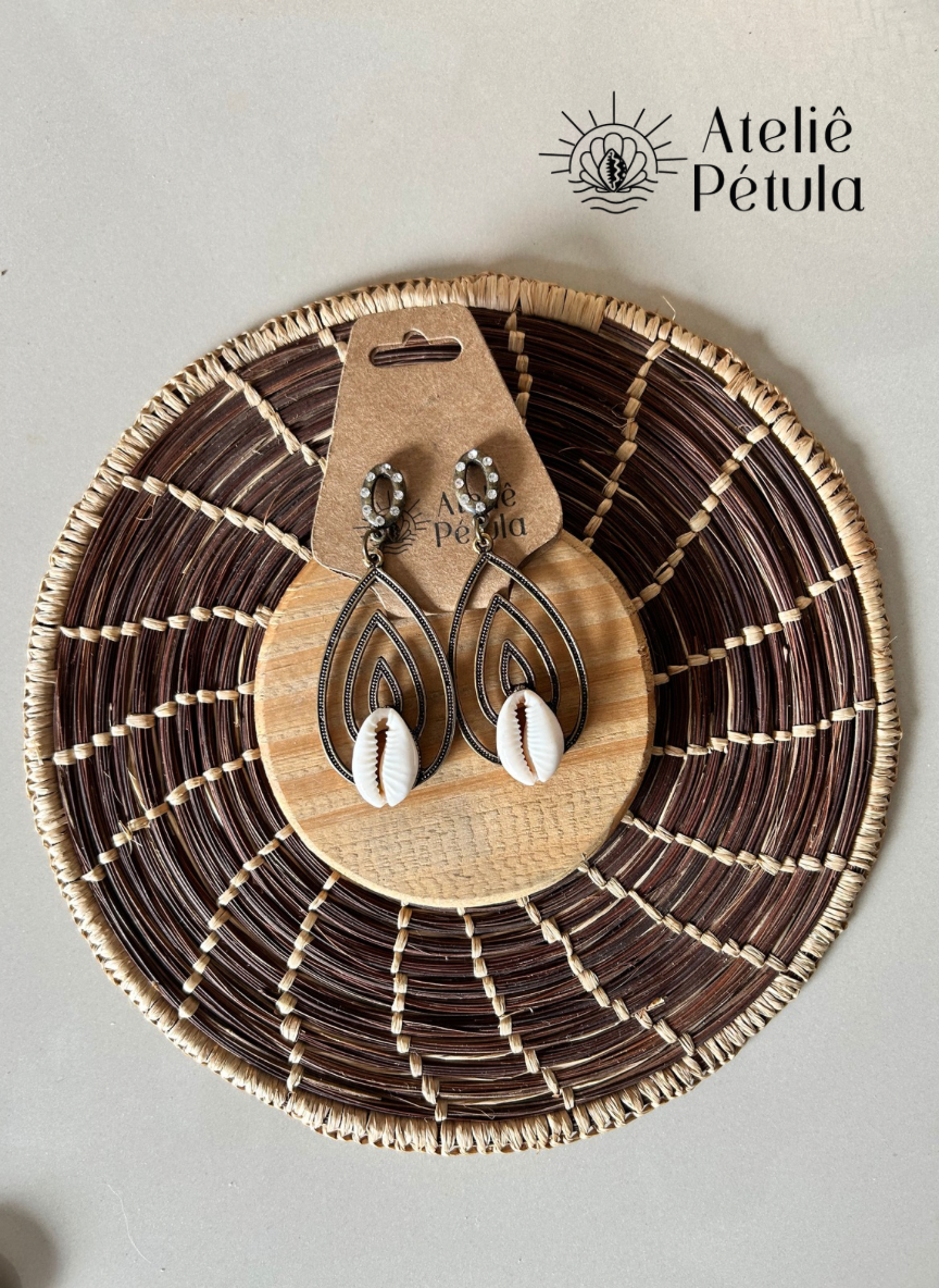 Brinco em ouro velho, com um búzio central e base com strass branco.