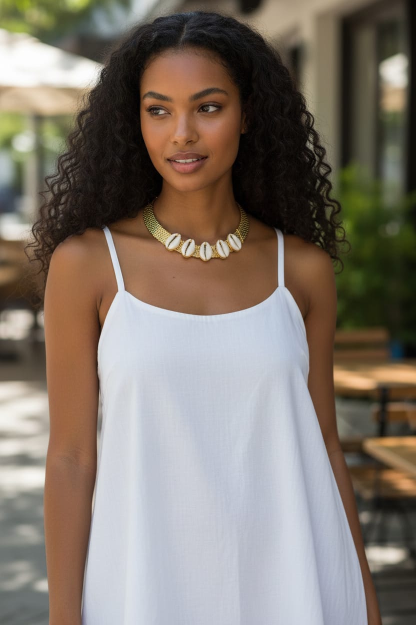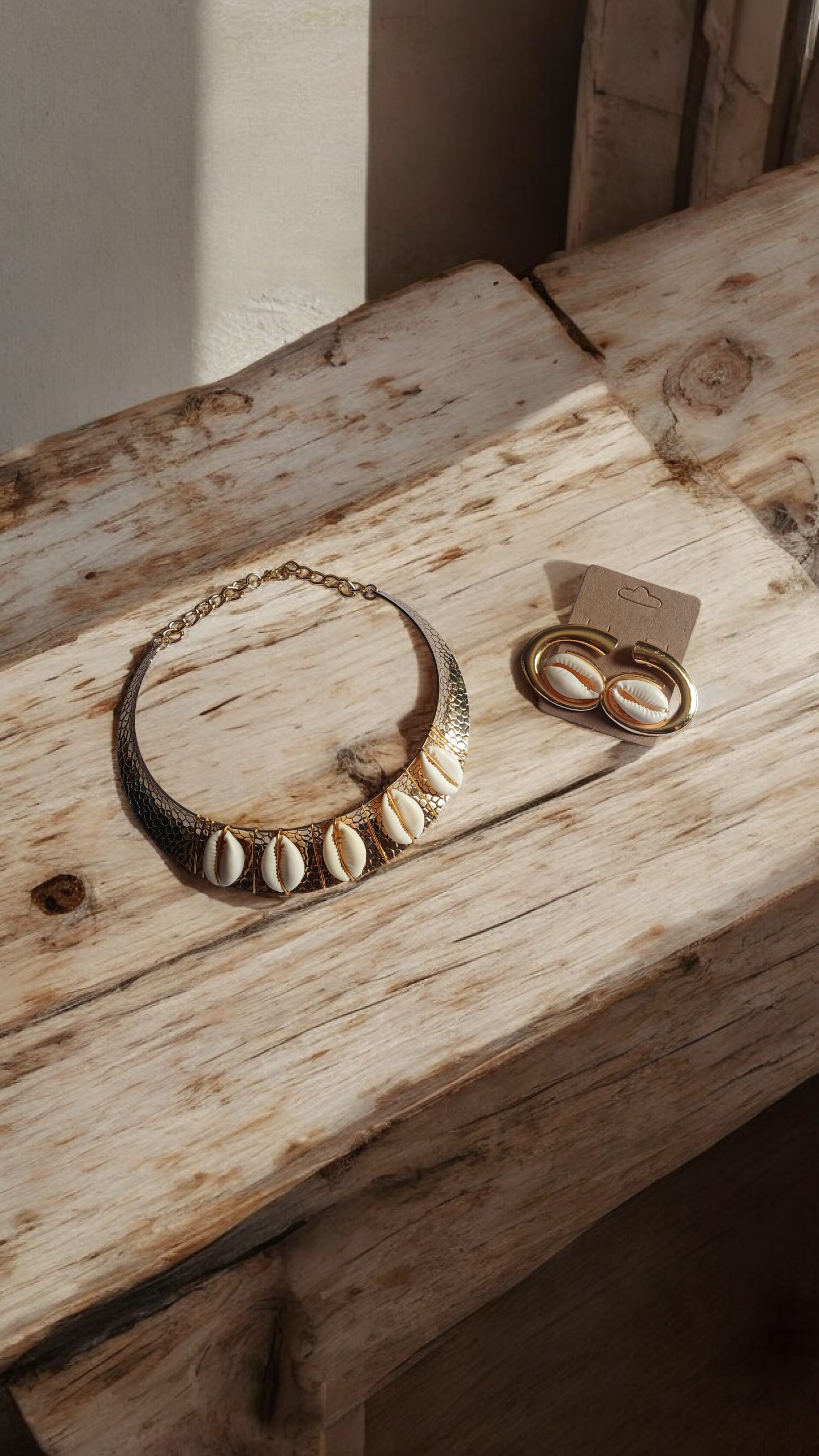 Um conjunto que une o brilho sofisticado do dourado à energia natural e ancestral dos búzios. A choker dourada abraça o colo com delicadeza, enquanto os búzios trazem simbolismo, beleza e força cultural. O resultado é uma peça moderna, elegante e cheia de personalidade — perfeita para quem ama acessórios com história e presença.