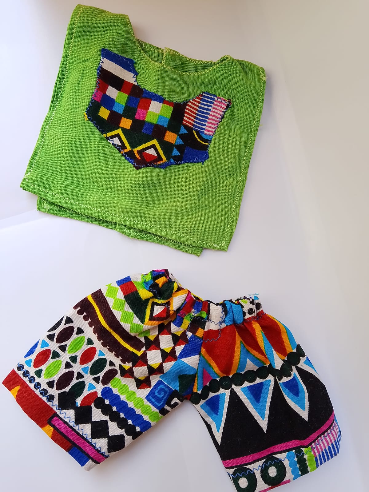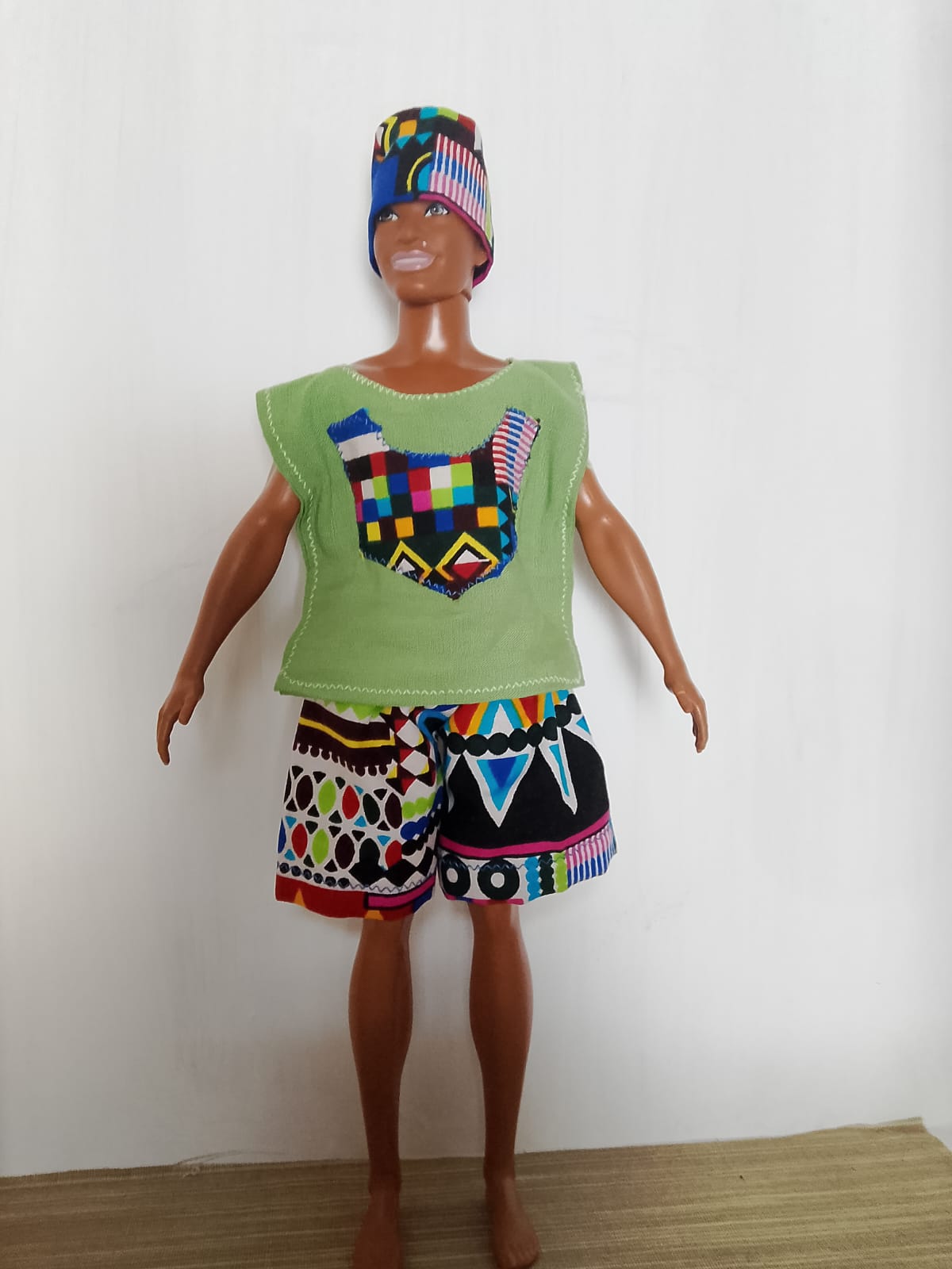 tecido de viscolinho liso com aplicação de detalhe em tecido afro. Veste o boneco Ken.