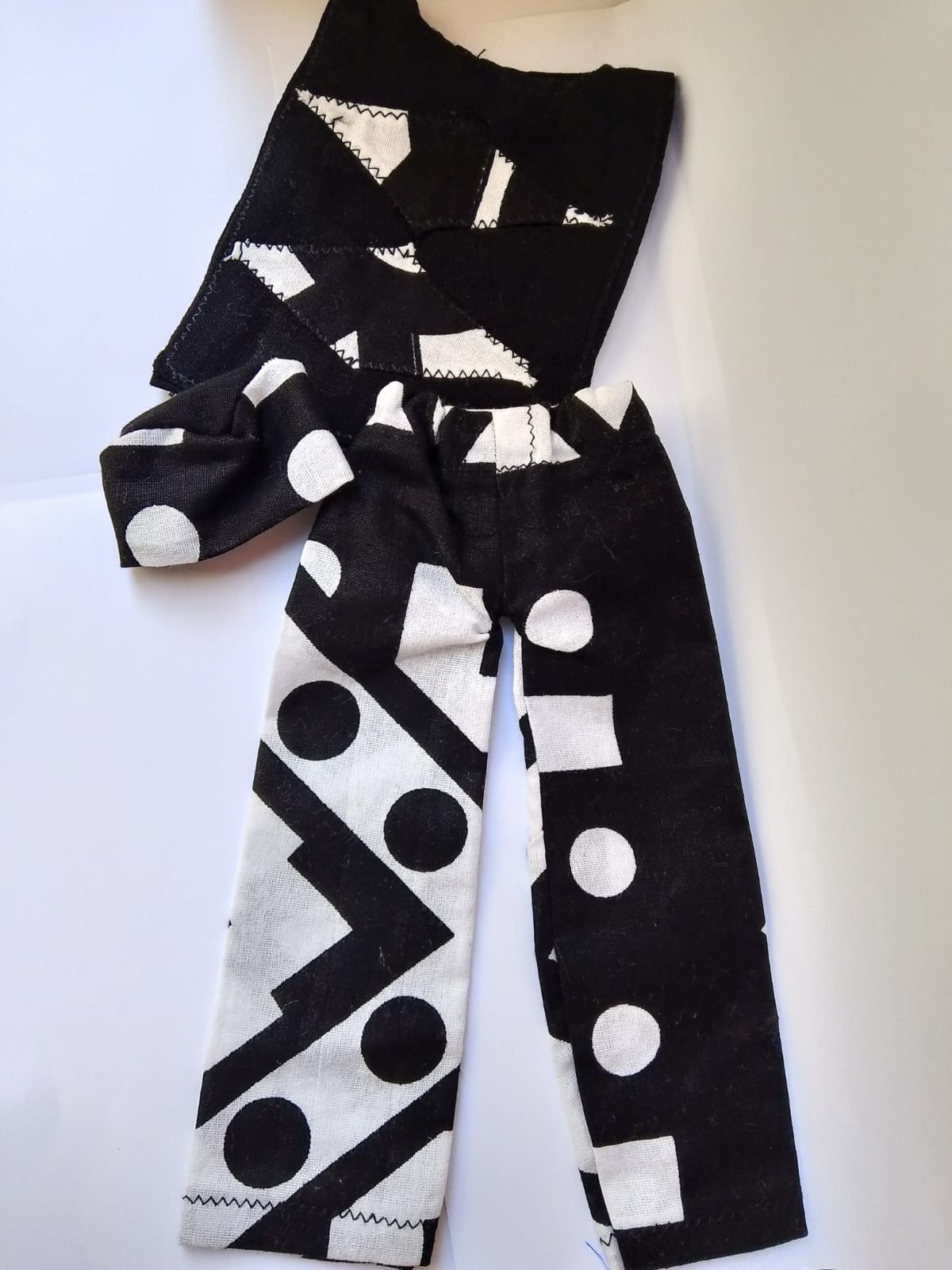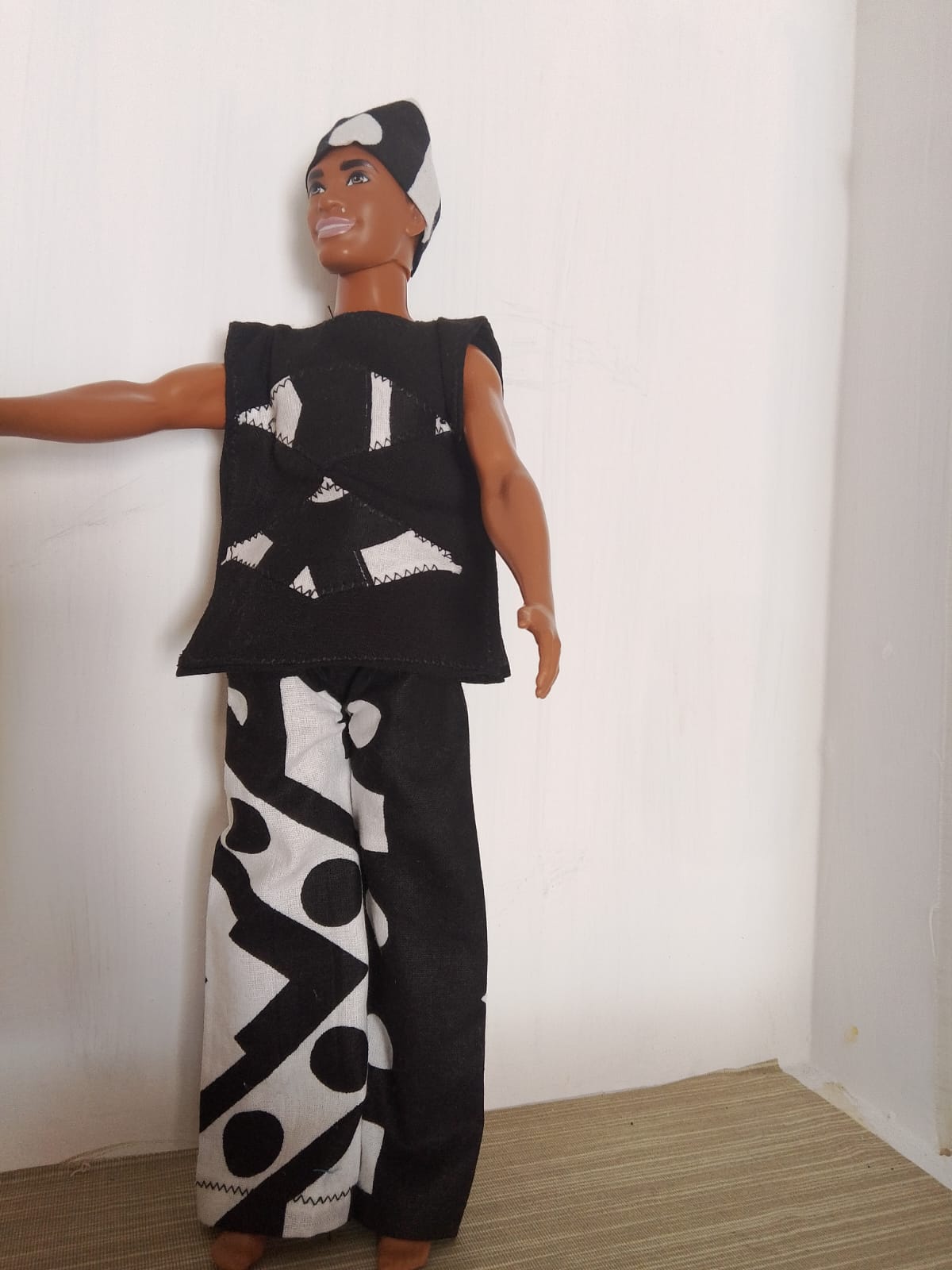 blusa feita com viscolinho liso e aplicação de detalhe em tecido afro. Kufi em tecido afro.