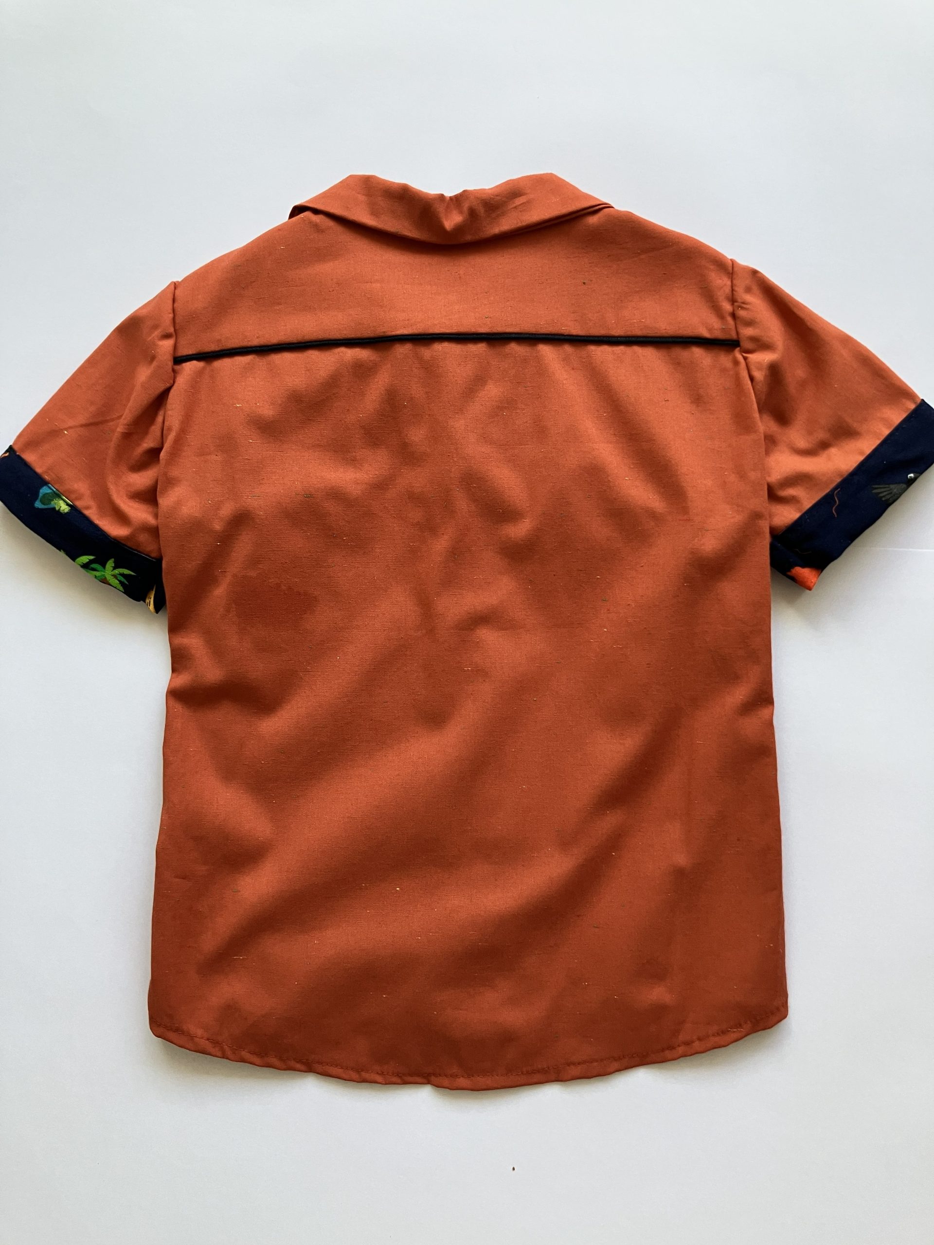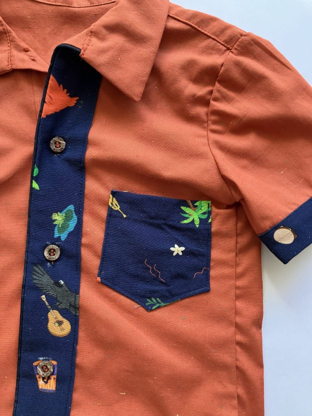 Camisa em tricoline 100% algodão e detalhes na estampa Festa no Ceu, abotoamento frontal com botões de coco e detalhe em vivo azul marinho na pala. Calça cargo azul royal em linho com viscose (70% viscose e 30% linho), ajuste de elástico no cós, passadores para cinto. 4 bolsos funcionais. Peças únicas 4 e 10 anos