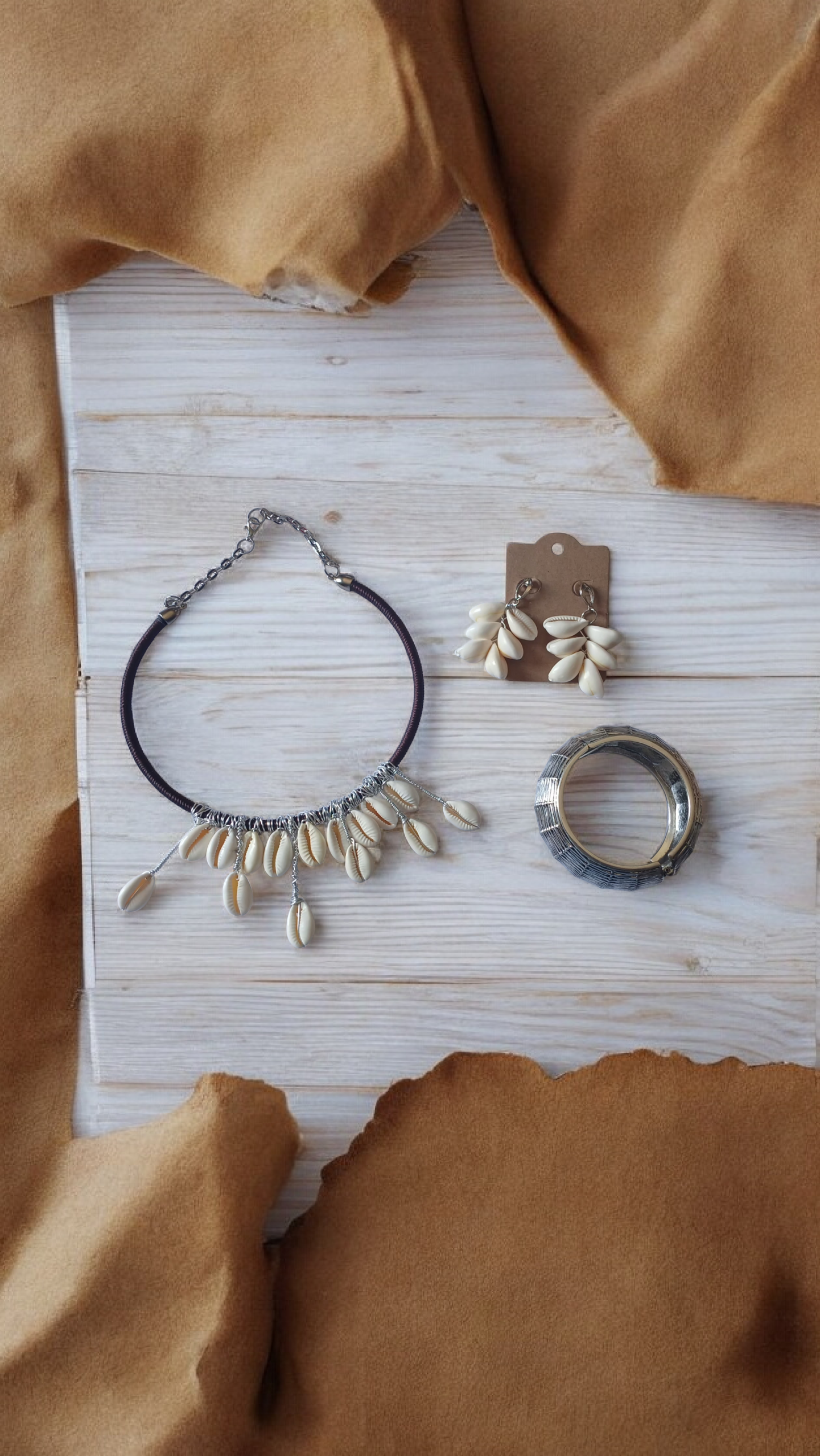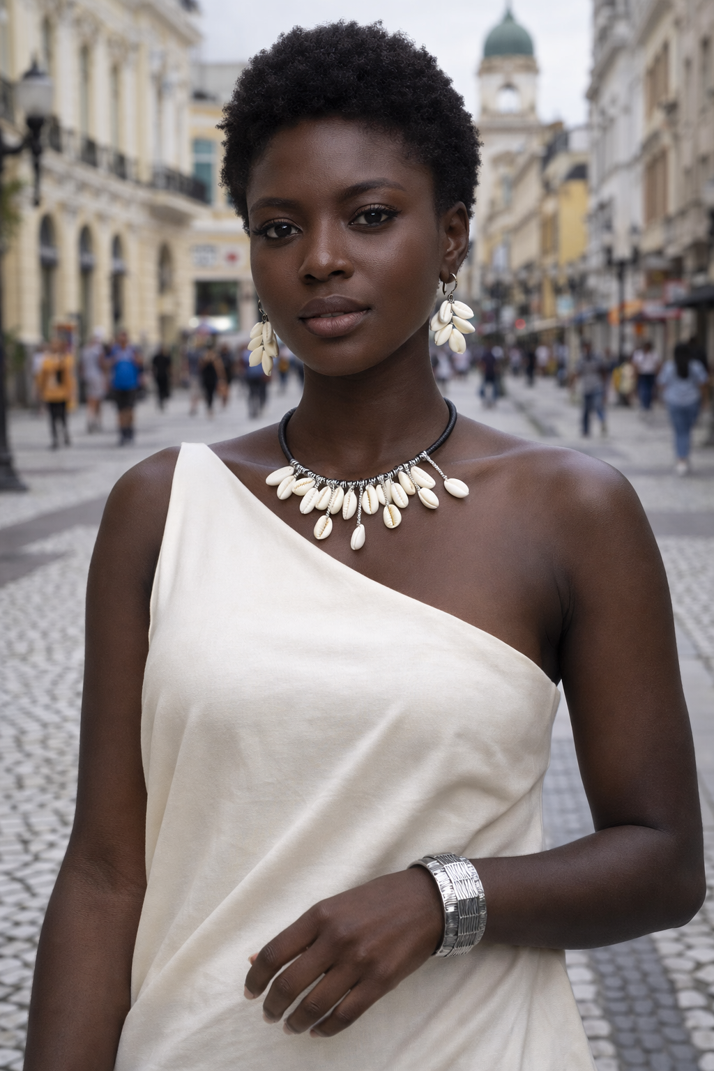 O choker forrado com fio proporciona conforto e resistência, valorizando o colo com sofisticação. Os búzios naturais, aplicados manualmente, carregam simbolismo de proteção, prosperidade e conexão com as raízes africanas. Os brincos em cascata de búzios trazem movimento e leveza, enquanto o bracelete metálico completa o conjunto com um toque contemporâneo e marcante.
