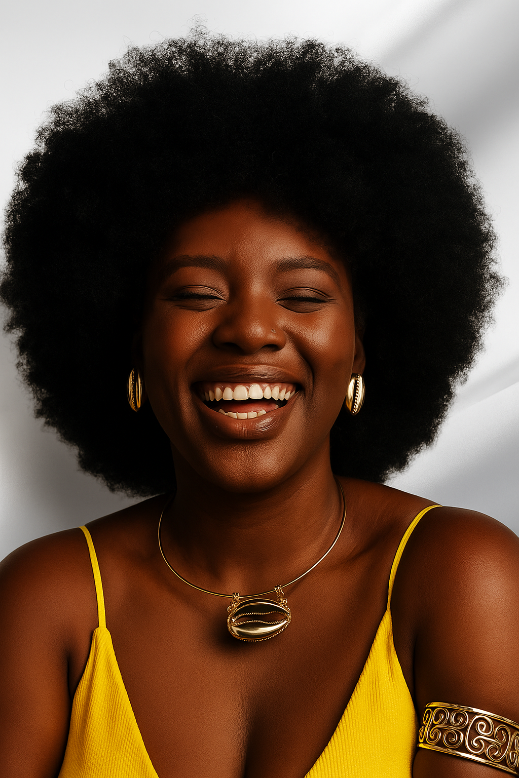 O amarelo vibrante se une ao afro contemporâneo para destacar a energia do sol, da vida e da realeza africana.