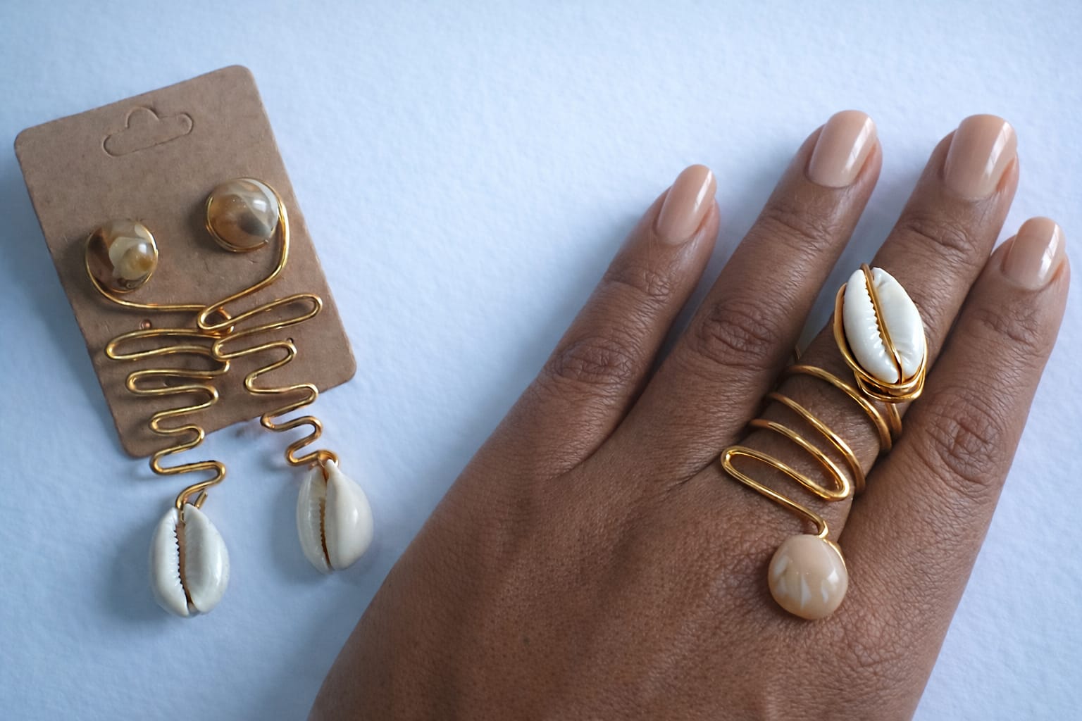 é feito artesanalmente em arame moldado à mão, com búzios naturais em formato orgânico.