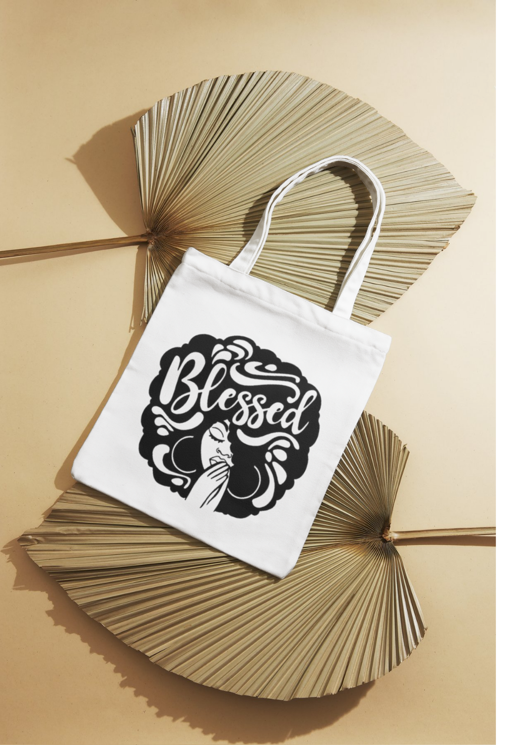 Ecobag resistente com estampa de mulher negra e palavra “Blessed”. Carregue consigo beleza, força e representatividade. Perfeita para todos os momentos.