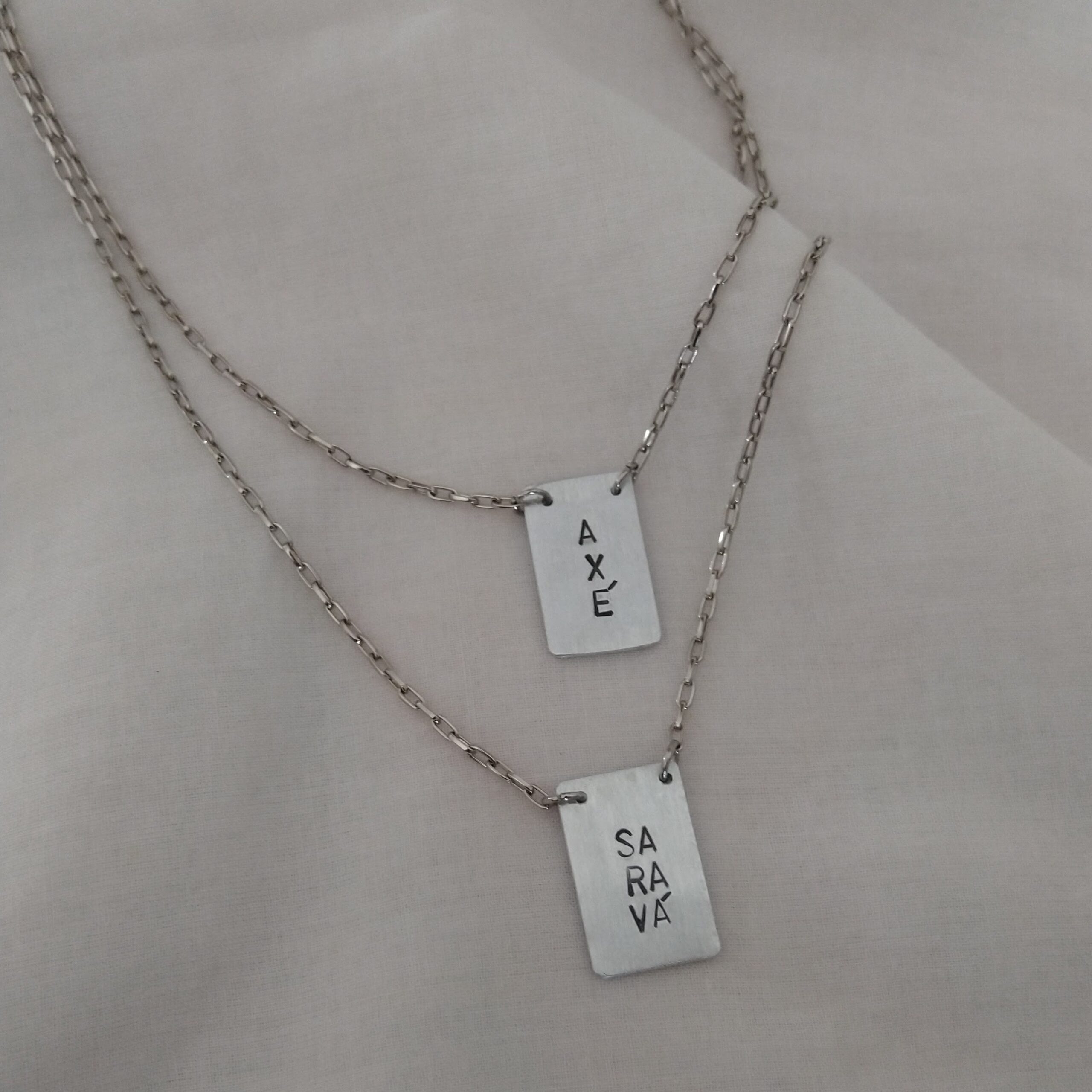 As palavras Axé e Saravá são meticulosamente gravadas à mão, tornando cada peça única e especial. Este escapulário não é apenas um acessório, mas uma expressão de nossa rica cultura e espiritualidade.