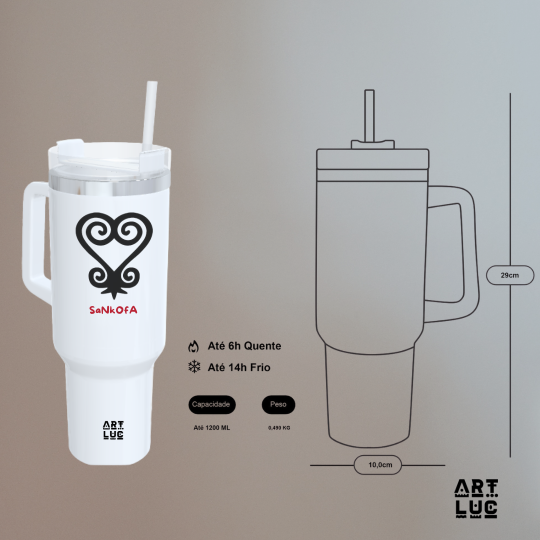 O Kit Sankofa é composto por uma Ecobag e um Copo Térmico com canudo reutilizável, ambos estampados com o símbolo africano Sankofa – que representa a importância de aprender com o passado para construir um futuro melhor.