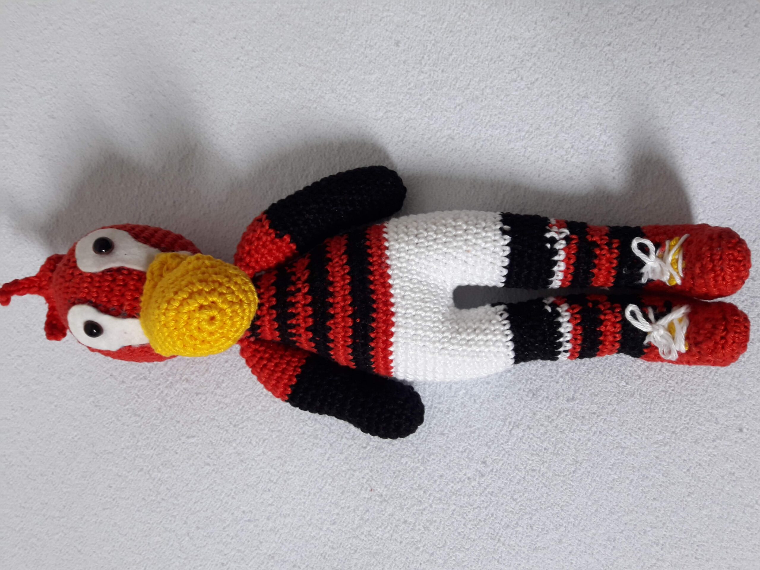 Boneco em amigurumi em formato de urubu feito em linhas de algodão mercerizado nas cores branco, preta e vermelha nas cores branco, vermelho e preto