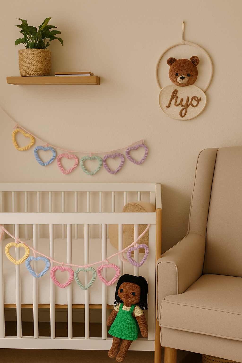 Deixe o quartinho do seu bebê ainda mais acolhedor e cheio de amor com nosso delicado varal de berço artesanal em tricotin! Um toque suave de cor e carinho para decorar com personalidade e estilo.