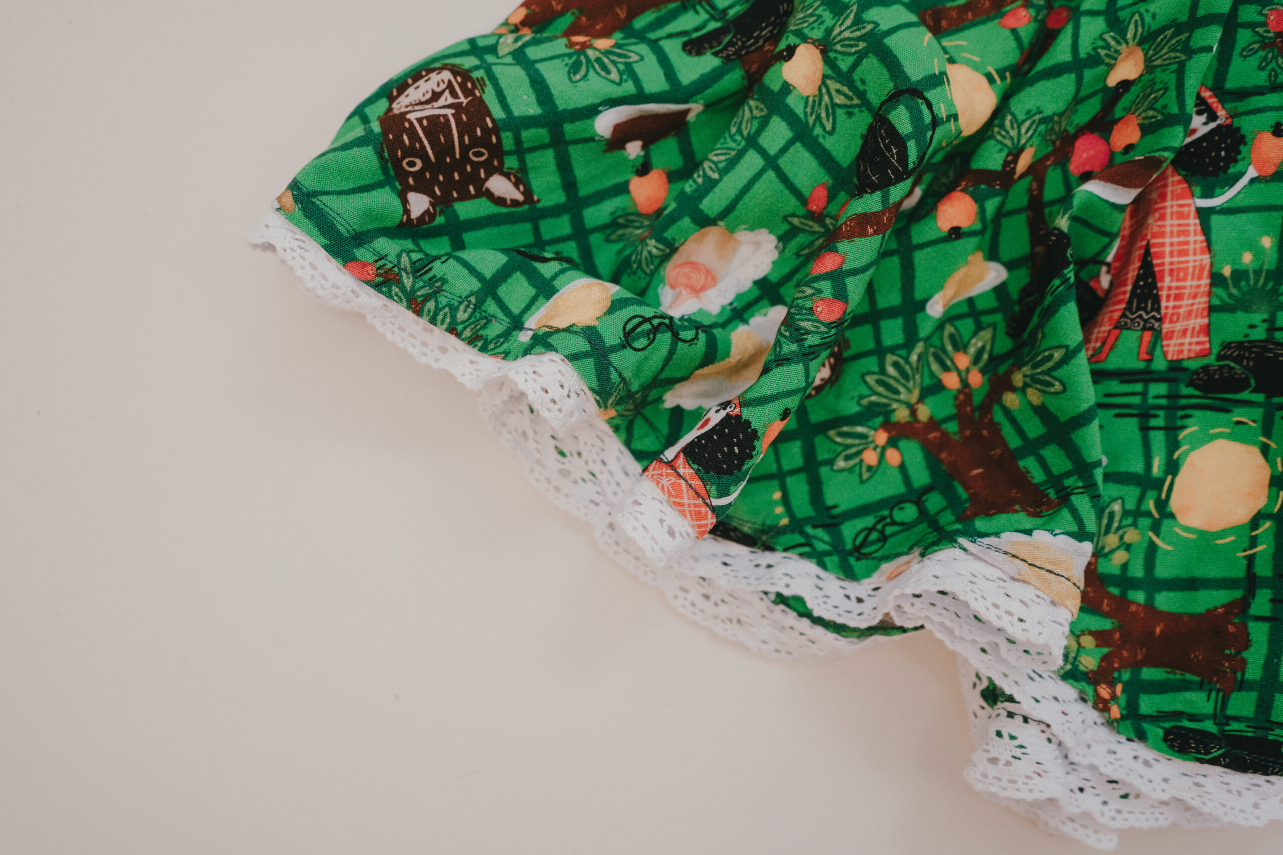 A Molu é uma marca autoral nordestina que reconta clássicos infantis com elementos da cultura popular. Nossa estampa a cesta da Vovozinha nordestina reconta a história da Chapeuzinho vermelho, trazendo as comidas tradicionais do nordeste como cuzcuz, bolo de rolo, pão delicia, num passeio por uma floresta de frutas tropicais.